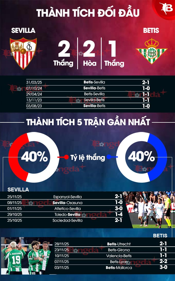 Sevilla có lợi thế sân nhà nhưng lại không có thành tích rất tệ khi chỉ thắng 3/10 trận đã qua. Chiều ngược lại, Betis đang chơi cực kỳ ấn tượng trên sân khách khi bất bại 9 trận vừa xong.