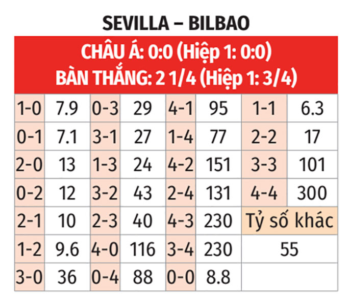 - Tối thiểu 10 phạt góc: 5/7 trận gần đây của Bilbao đều có tối thiểu 10 quả phạt góc. Cả 4 trận gần nhất giữa đội bóng này và Sevilla số phạt góc cũng đều cao hơn 9.
