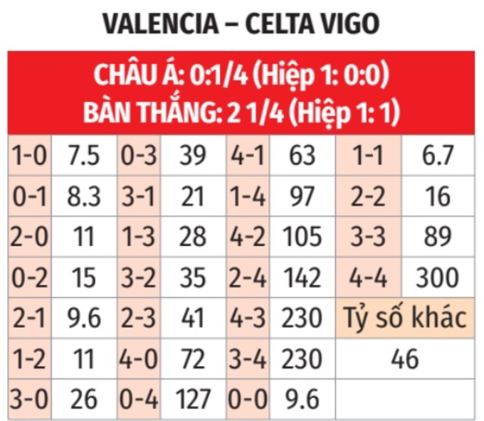 - Tối thiểu 1 bàn hiệp 1: 9/10 lần gặp giữa 2 đội gần đây có ít nhất 1 bàn thắng trong hiệp 1. Tình trạng tương tự xảy ra ở 4/5 trận gần đây của Valencia và 5/6 trận vừa qua của Celta Vigo.