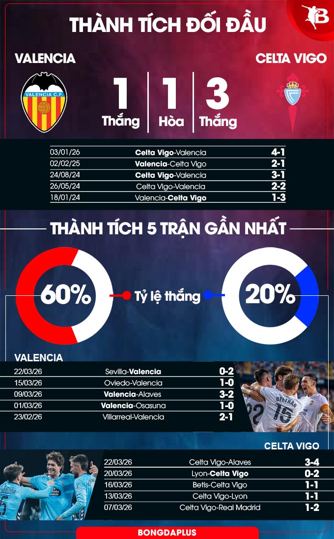 Valencia càng có cơ sở để tin tưởng có thể hoàn thành mục tiêu giành 3 điểm ở trận đấu này khi họ được chơi trên sân nhà. Xin nhấn mạnh rằng, trong 8 lần gần đây tiếp đón Celta Vigo ở Mestalla trong khuôn khổ La Liga, "Bầy dơi" áp đảo gần như tuyệt đối khi giành 7 chiến thắng và hòa 2 trận.
