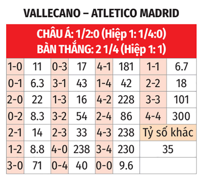 - Vallecano thắng hiệp 1 theo châu Á: Vallecano thắng hiệp 1 theo châu Á ở 3/4 trận gặp Atletico gần nhất (không kể giao hữu). Tiếp đón Atletico thua hiệp 1 theo châu Á ở 4/5 trận sân khách gần nhất, đội chủ nhà là sự lựa chọn đáng tin hơn trước giờ nghỉ.