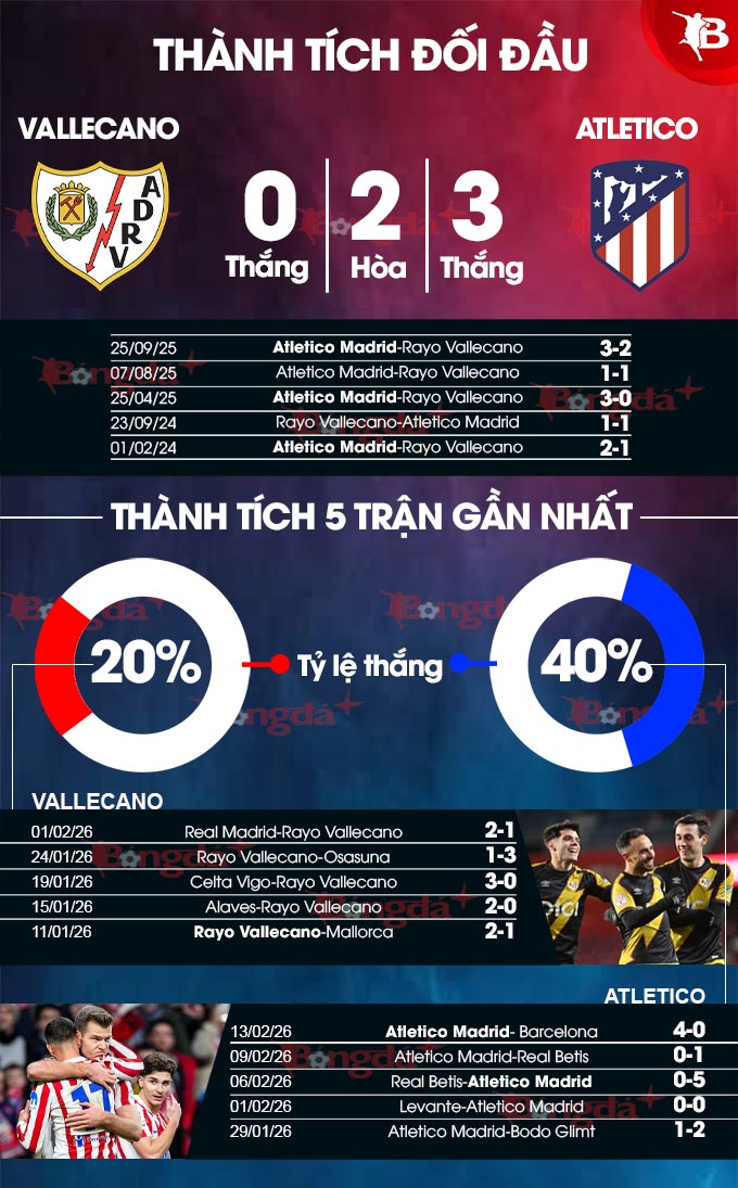 Đáng chú ý, Atletico không chỉ hơn hẳn Vallecano về đẳng cấp mà họ còn hoàn toàn vượt trội đối phương ở thành tích đối đầu. Chỉ phải gặp đối thủ chỉ biết hòa và thua ở cả 20 cuộc đụng độ gần nhất giữa 2 bên, cơ hội để Atletico giành thêm một chiến thắng là rất sáng.