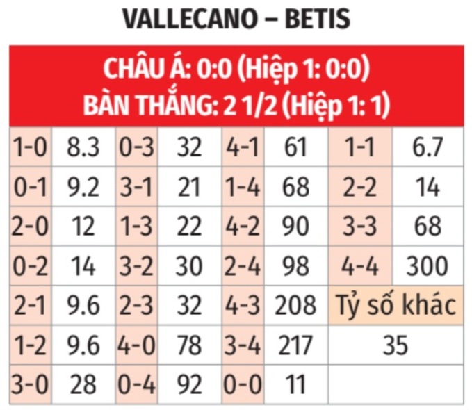 • Cả trận không quá 2 bàn: 3/4 lần đối đầu giữa 2 đội gần đây kết thúc với nhiều nhất 2 bàn thắng. Cả 4 trận gần đây của Vallecano và 3/4 trận vừa qua của Betis ở La Liga xảy ra tình trạng tương tự.