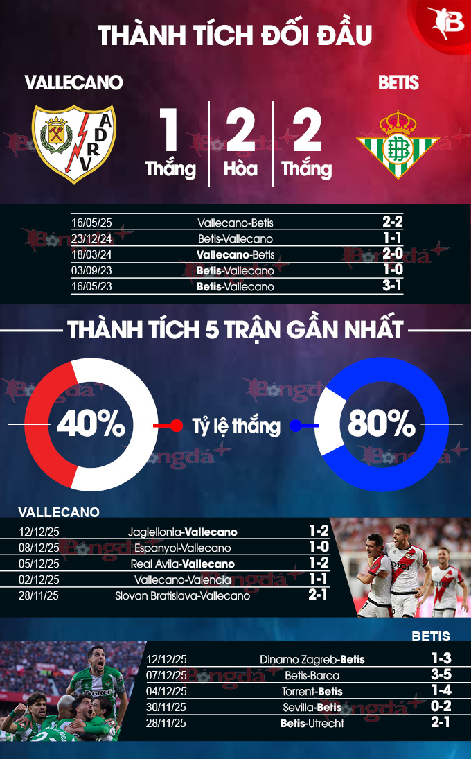Trong khi đó, Vallecano lại đang có vấn đề về phong độ. Theo quan sát, họ đang trải qua mạch 6 trận liên tiếp không biết mùi chiến thắng tại giải nội địa. Trong đó, đoàn quân của HLV Inigo Perez để thua 0-1 trên sân của Espanyol ở vòng đấu gần đây nhất tại La Liga. Kết quả đó khiến họ tụt xuống vị trí thứ 12 tại bảng xếp hạng, kém Betis 6 bậc.