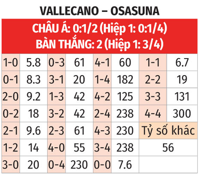 Trong khi đó, Osasuna đang chơi dở ở sân khách khi chỉ thắng 1/8 trận gần nhất, tính trong 90 phút. Chưa hết, 10 lần gần nhất khi làm khách trước Vallecano, Osasuna thua tới 6, hòa 2 và thắng 2. Do đó, không ngạc nhiên nếu Vallecano có trọn vẹn 3 điểm ở trận này.