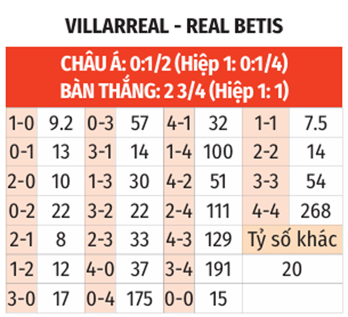 - Chẵn bàn thắng: 2 trận gần nhất của Villarreal có tổng bàn thắng chia hết cho 2. Ngoài ra, 7/10 trận vừa qua của Betis chứng kiến điều tương tự.