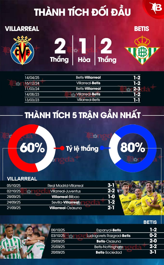 Cụ thể, trong khi Villarreal chỉ thắng 3/5 trận gần nhất thì Betis bất bại ở cùng thời gian. Lần này, Villarreal có lợi thế sân nhà và có thành tích bất bại ở đây.