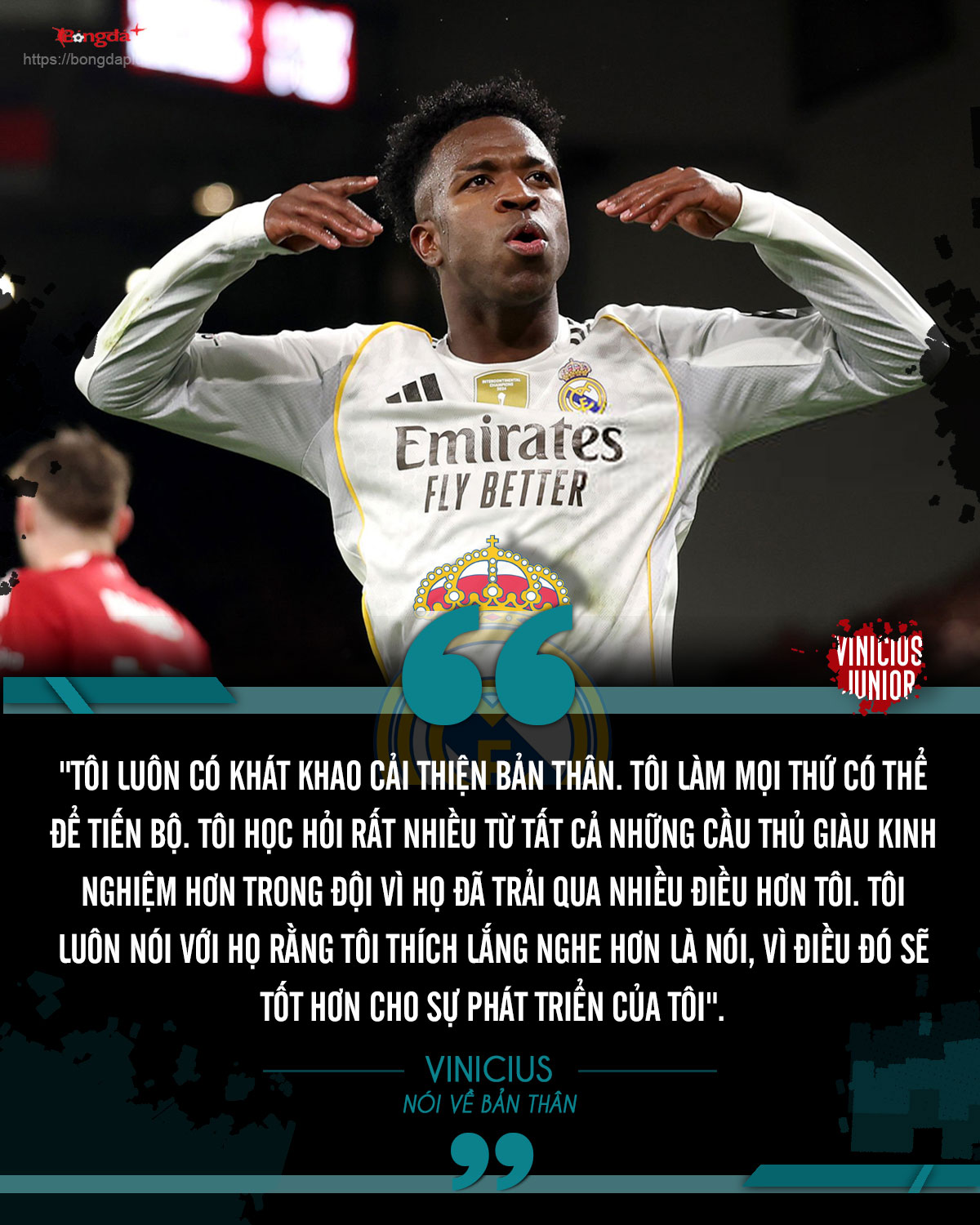 Ban lãnh đạo Real Madrid cũng hoàn toàn hài lòng. Họ thậm chí từ chối xem xét những lời đề nghị khổng lồ từ Saudi Arabia. Khi đó, có cảm giác Vinicius đã thực sự phát huy trọn vẹn tiềm năng và mọi người chờ đợi những bước nhảy vọt tiếp theo. Song hiện tại, bức tranh quanh tiền đạo 25 tuổi đã hoàn toàn khác, sau mùa 2024/25 cùng nửa đầu mùa giải 2025/26 đầy khó khăn và thất vọng cá nhân.