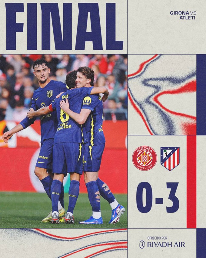 Atletico đá rất thong dong ở hiệp 2 do Girona không tạo nổi áp lực nào lên vòng cấm của đội khách. Và tới phút 90+2, đội khách đã có bàn thắng thứ 3 nhờ công của Antoine Griezmann. Thắng 3-0, Atletico chiếm vị trí thứ 3 của Villarreal khi nhiều hơn 2 điểm.