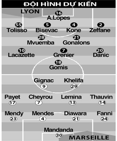 Sẽ không có nhiều thay đổi so với chiến thắng 2-1 ở vòng bảng Europa League trước Vitoria Guimaraes, ngoài việc ba trụ cột Gonalons, Lacazette và Grenier trở lại đội hình xuất phát. Hai hậu vệ trẻ Tolisso và Zeffane tiếp tục được trao cơ hội đá chính ở hai biên. Trong bối cảnh M.Lopes và Dabo chấn thương, Bedimo không có phong độ cao, thì sự lựa chọn này của HLV Garde là tối ưu nhất. Ngoài ra, hiệu suất ghi bàn cao của chân sút trẻ Lacazette (ghi 4 bàn ở 4 trận đá chính gần nhất tại Ligue 1) cũng là nhân tố giúp Lyon tự tin đón tiếp Marseille đêm nay.