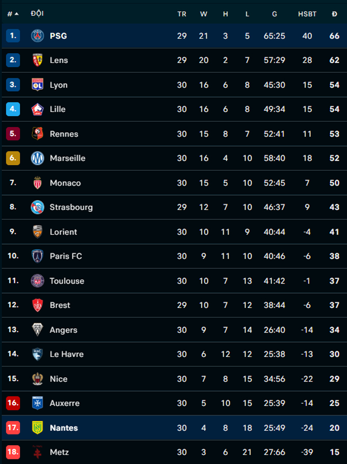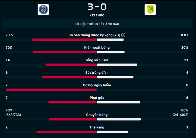 Với chiến thắng này, PSG trụ vững ở ngôi đầu bảng Ligue 1 (66 điểm/29 trận), đồng thời nới rộng cách biệt với đội xếp sau Lens lên 4 điểm.