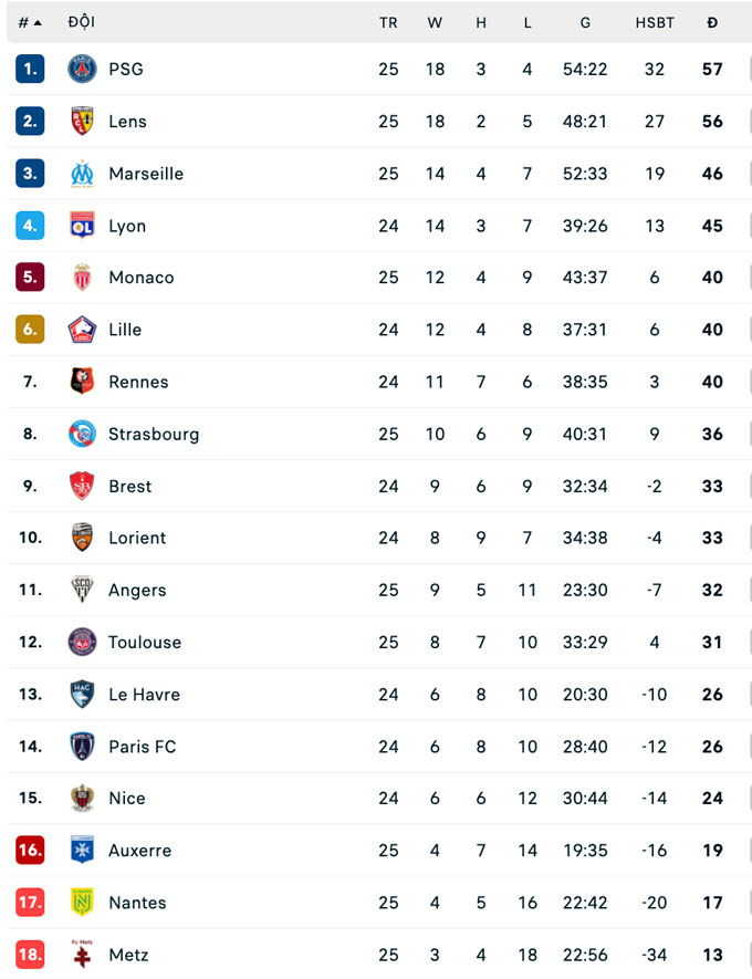 Trong khi đó, trận đấu giữa PSG và Nantes đã được dời sang thời điểm khác để đội bóng thủ đô có thể tập trung cho hai lượt trận gặp Chelsea tại vòng 1/8 Champions League. Điều này càng khiến cuộc đua vô địch Ligue 1 trở nên hấp dẫn hơn khi Lens đang bám đuổi rất sát phía sau.