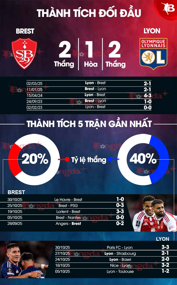 - Hiệp 1 từ 2 bàn trở lên: Cả hai cuộc đối đầu gần nhất, 5/7 trận vừa qua của Brest và 2/3 trận gần đây của Lyon tại Ligue 1 đều có ít nhất 2 bàn thắng trong hiệp 1. Kịch bản tương tự cũng xảy ra ở 4/6 cuộc đối đầu vừa qua tại Brest, ở 5/6 trận sân nhà gần đây của Brest. Trận này khó có ngoại lệ.