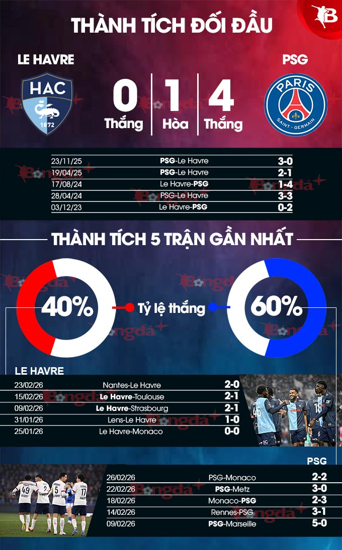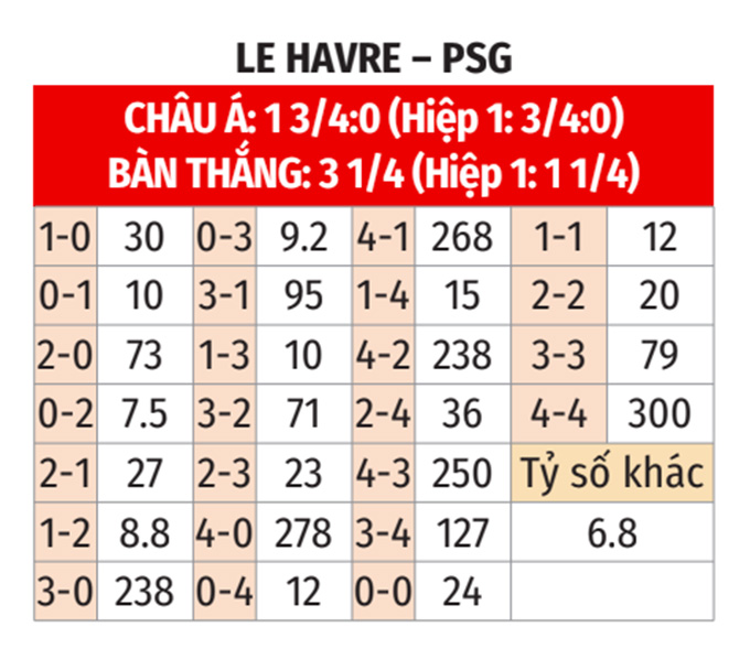 Rất khó có bất ngờ xảy ra, ngay cả khi Le Havre được chơi trên sân nhà. Vì thế, nhiều khả năng PSG sẽ thắng trận nhưng thua theo châu Á, ghi bàn trong hiệp 1 và nâng chuỗi bất bại trước Le Havre lên con số 12 để tăng tốc ở Ligue 1.