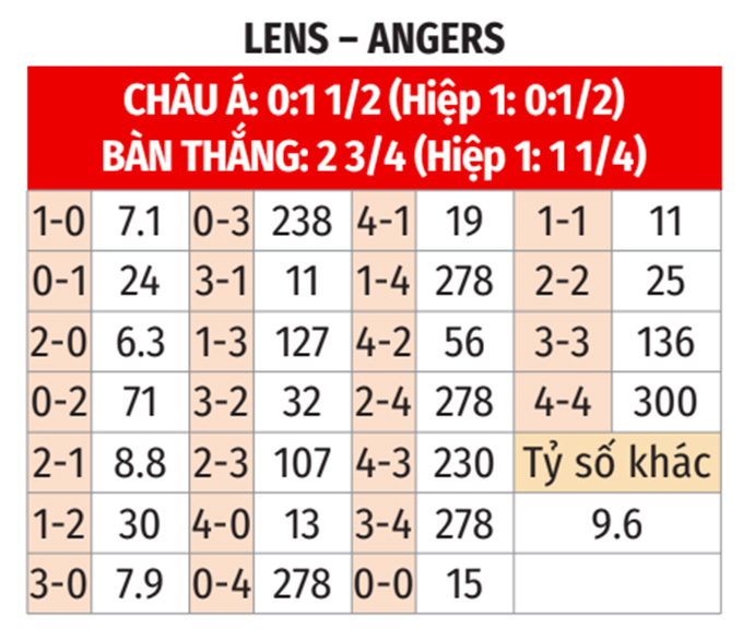 - Lẻ bàn thắng: Cả 6 cuộc đối đầu gần nhất, 4/6 trận gần đây của Lens và 9/13 trận vừa qua tại Ligue 1 của Angers đều có tổng bàn thắng là lẻ. Ngoài ra, 9/12 trận sân nhà vừa qua của Lens cũng có tổng bàn thắng không chia hết cho 2.