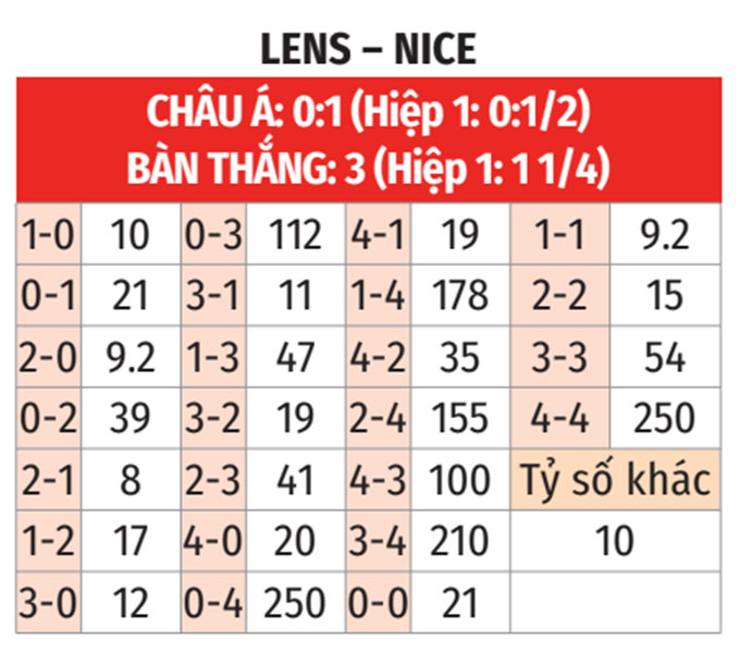 - Lens thắng theo châu Á: Trong khi Lens đang có chuỗi 5 trận thắng theo châu Á liên tiếp, thì Nice lại thua theo châu Á ở cả 7 trận vừa qua. Căn cứ vào thực tế trên, sẽ là mạo hiểm nếu đặt niềm tin vào đội khách.