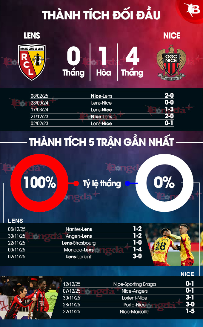 - Hai đội không cùng ghi bàn: 3/4 trận gần đây của Nice đều có đội "tịt ngòi". 6/7 trận gần nhất giữa đội bóng này và Lens cũng có đội bất lực trong việc tìm đường vào khung thành đối phương.