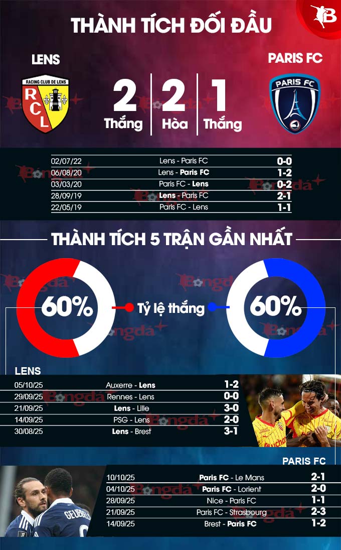 - Không đội nào giữ sạch lưới nhà: 2/3 cuộc đối đầu chính thức gần nhất, 5/7 trận sân nhà gần đây của Lens đều khép lại mà không đội nào giữ sạch được lưới nhà. Ngoài ra, 10/12 trận gần đây của Paris FC và 7/9 chuyến làm khách vừa qua của Paris FC đều có ít nhất 1 bàn thắng cho mỗi đội.