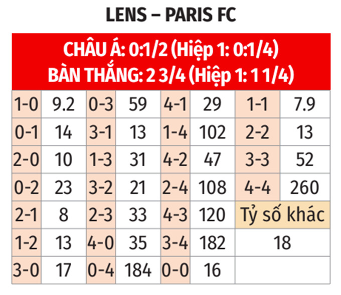 - Hiệp 1 không quá 1 bàn: 6/8 cuộc đối đầu gần nhất, 9/11 trận gần đây của Lens và 5/6 trận sân nhà vừa qua của Lens đều có tối đa 1 bàn thắng trong hiệp đấu đầu tiên. Trận này khó có ngoại lệ.