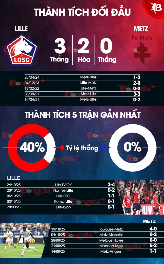 Xét về đối đầu, Metz chưa từng thắng Lille ở 9 trận đấu gần nhất tại Ligue 1. Thành tích tốt nhất của họ ở chuỗi trận nói trên là 3 trận hòa, còn lại là 6 thất bại. Trên sân của Lille, Metz cũng chỉ ca khúc khải hoàn duy nhất 1 lần ở 11 trận vừa qua tại giải đấu danh giá nhất nước Pháp, còn lại hòa 5 và thua 5 trận.