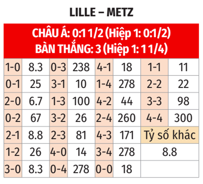 - Lẻ bàn thắng: 6/8 trận gần nhất của Lille và 5/8 trận vừa qua của Metz đều khép lại với tổng bàn thắng là lẻ. Ngoài ra, 6/7 trận sân nhà gần đây của Lille và 3/4 chuyến làm khách vừa qua của Metz đều có tổng bàn thắng không chia hết cho 2.