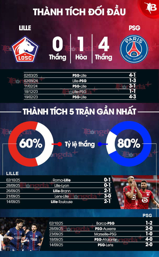 Cần nhấn mạnh rằng, PSG thắng 7, hòa 1 ở 8 cuộc đối đầu gần nhất với Lille tại Ligue 1. Trận hòa duy nhất nói trên (1-1) diễn ra vào tháng 12/2023 trong một trận cầu mà Kylian Mbappe mở tỷ số cho PSG, còn Jonathan David gỡ hòa cho Lille ở phút bù giờ cuối cùng.