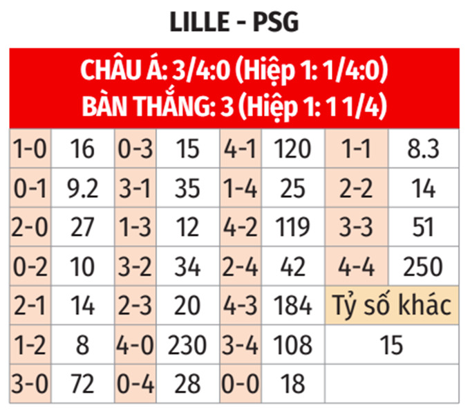 - Hiệp một tối đa một bàn: 6/7 trận gần nhất của Lille và 6/9 trận gần đây của PSG đều có không quá 1 bàn thắng trong hiệp đấu đầu tiên. Kịch bản tương tự ở hiệp 1 cũng xảy ra ở 7/8 trận sân nhà vừa qua của Lille và 6/9 chuyến làm khách gần nhất của PSG.