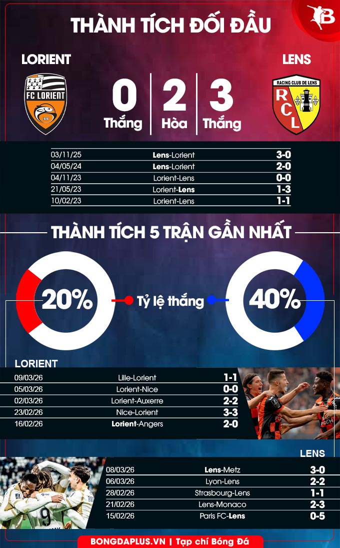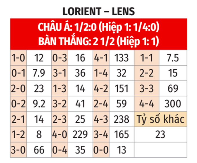 - Lens ghi bàn hiệp 1: Lens ghi ít nhất 1 bàn trong hiệp 1 ở 7/8 trận gần đây, ở 7/10 chuyến làm khách vừa qua. Họ cũng ghi bàn vào lưới Lorient trong hiệp 1 ở 4/6 cuộc chạm trán vừa qua.