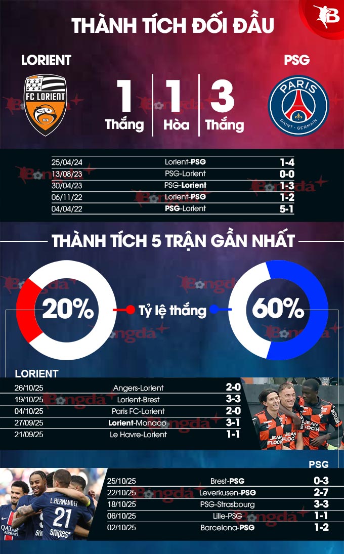 Xét về thành tích đối đầu, PSG đang hoàn toàn áp đảo. Cụ thể, họ thắng 16, hòa 3, chỉ thua 2 ở 21 lần đụng độ gần nhất với Lorient. Nếu xét lịch sử xa hơn, thì ở 38 lần đối đầu gần nhất, Lorient thắng 9, hòa 7 và thua 22 trận.