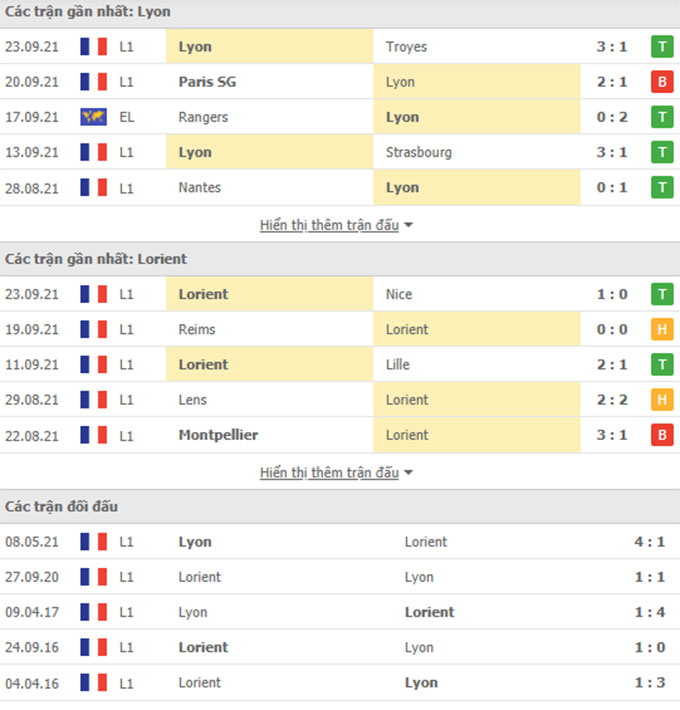 Thành tích gần đây Lyon vs Lorient