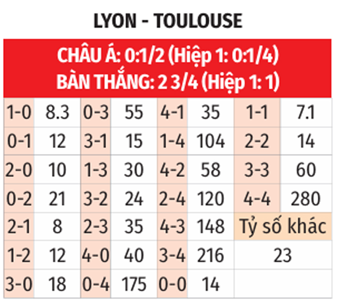- Lẻ bàn thắng: 7/10 trận đối đầu gần đây giữ 2 đội có tổng bàn thắng không chia hết cho 2. Ngoài ra, 8/10 trận vừa qua của Lyon và 3/4 trận vừa xong của Toulouse đều chứng kiến điều tương tự.