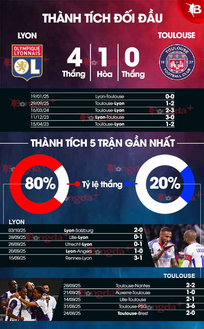 0 - Lyon không thua Toulouse trong 10 lần gặp nhau gần nhất, với 8 trận thắng và 2 hòa.