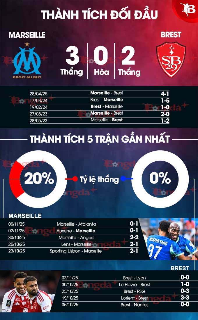 - Marseille ghi bàn hiệp 1: Marseille ghi bàn trong hiệp 1 ở 3/4 cuộc đối đầu gần nhất, ở 4/6 trận gần đây và ở 11/13 trận sân nhà vừa qua. Ngoài ra, Marseille cũng xuyên thủng lưới Brest ít nhất 1 lần trong hiệp 1 ở 7/9 lần gần nhất đón tiếp họ tại sân Velodrome.