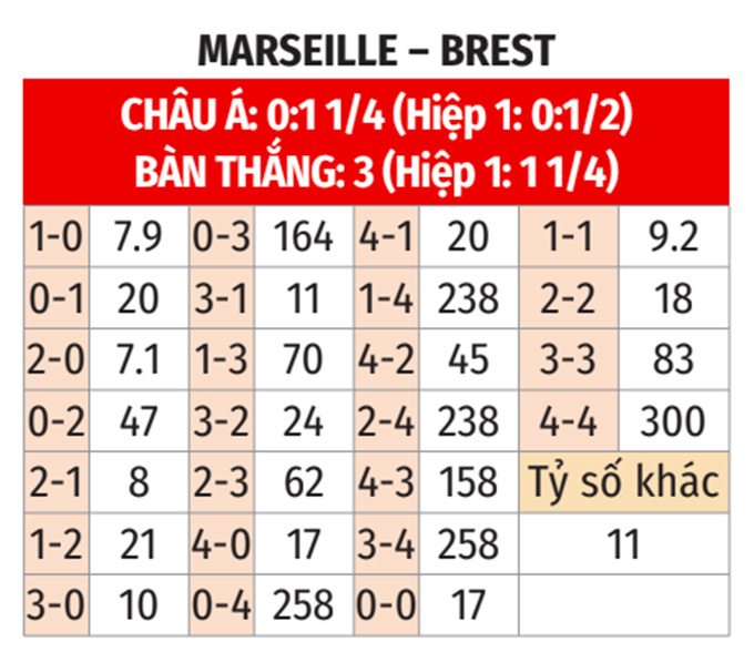 - Marseille thắng theo châu Á: Marseille thắng 6/8 trận gần nhất tại Ligue 1, thắng 6/8 trận sân nhà vừa qua trên mọi đấu trường. Trong khi đó, Brest không thắng ở 8/11 trận gần đây. Vì thế, những người yêu mến OM có thể đặt niềm tin vào họ ở trận này.