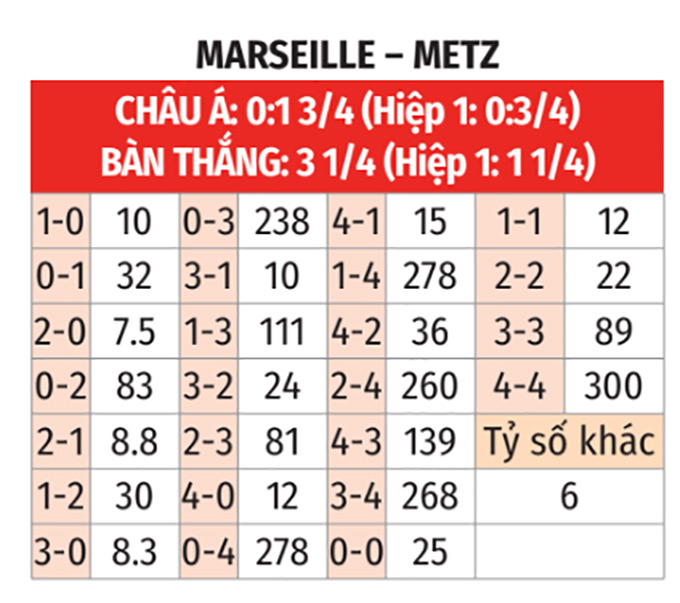 - Tỷ số lẻ: 4/6 trận gần đây của Metz kết thúc với tỷ số lẻ. 4 trận vừa qua của Marseille cũng có số bàn thắng không chia hết cho 2.