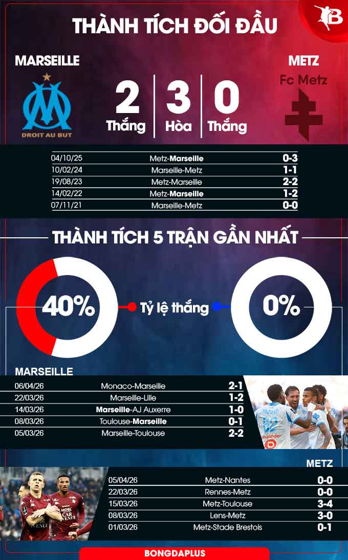 Trên sân khách, tình hình còn tệ hơn khi Metz chỉ thắng 1/14 trận tại Ligue 1 từ đầu giải (hòa 2, thua 11). Lịch sử đối đầu cũng quay lưng với họ. 10 lần chạm trán gần nhất không thắng Marseille (hòa 6, thua 4) là quá đủ để chỉ ra ưu thế đang nghiêng về bên nào.