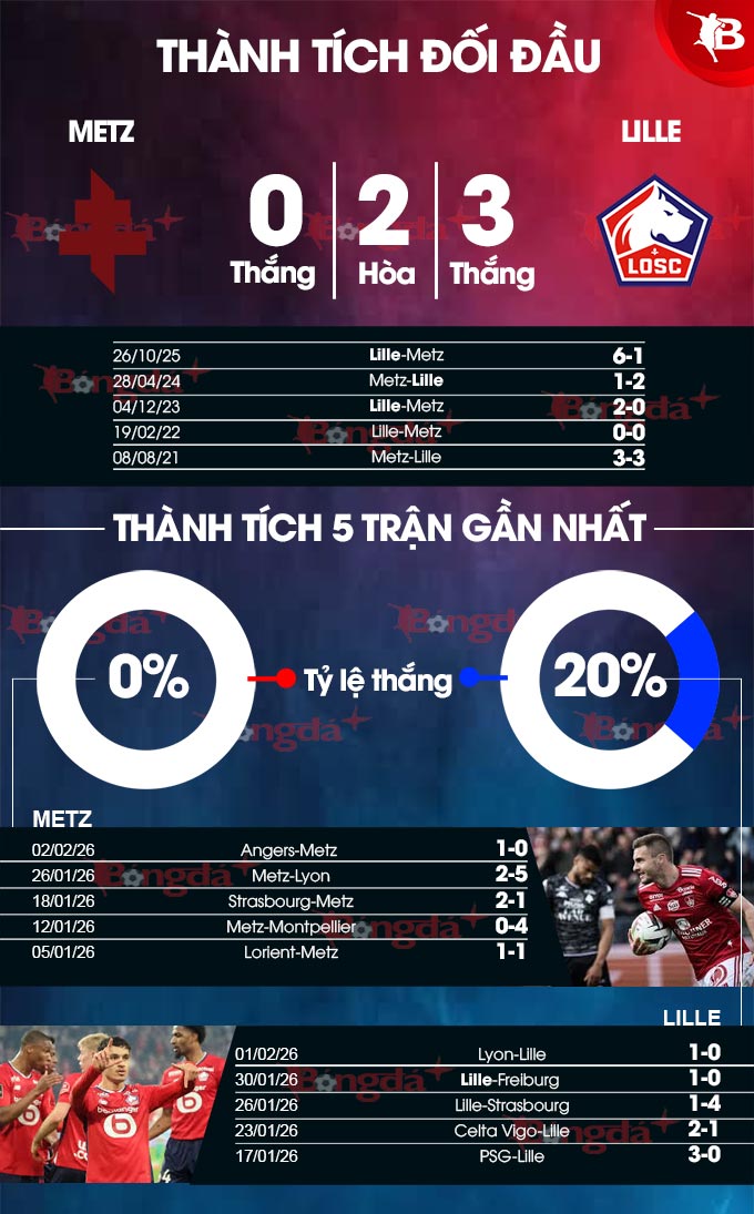 Tuy vậy, Lille cũng có sự tự tin nhất định khi hành quân tới Metz. Bởi họ áp đảo hoàn toàn ở 10 cuộc chạm trán gần nhất giữa hai đội, với 7 chiến thắng và 3 trận hòa. Trên sân của Metz, Lille cũng chỉ thua đúng 1 lần, hòa 2 và thắng 8 ở 11 trận vừa qua.