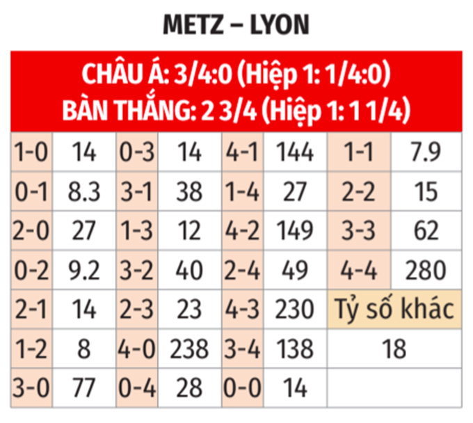 - Từ 3 bàn trở lên: 4/5 cuộc đối đầu gần nhất, 7/9 trận gần đây của Metz và 4/5 trận vừa qua của Lyon đều có ít nhất 3 bàn cả trận. Ngoài ra, 9/11 cuộc chạm trán gần đây giữa hai đội tại Metz cũng có tối thiểu 3 lần lưới rung cả trận.
