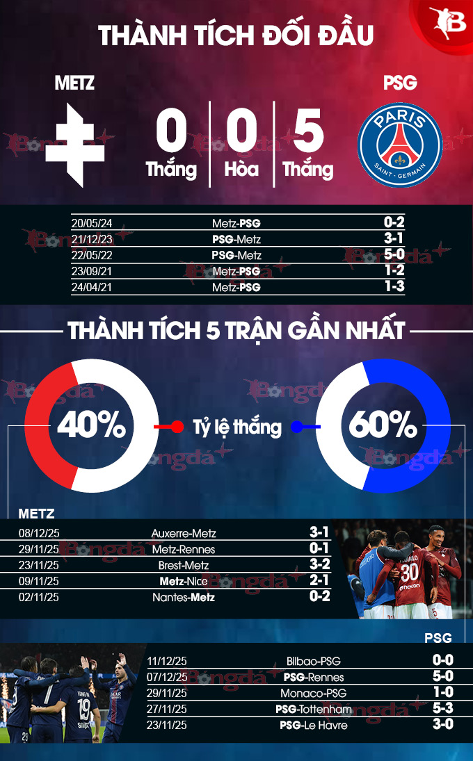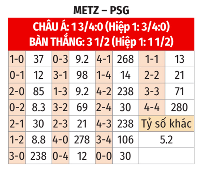 - Lẻ bàn thắng: 3/4 trận gần nhất của Metz và 6/8 trận vừa qua của PSG đều khép lại với tổng bàn thắng là lẻ. Ngoài ra, 3/4 trận sân nhà gần đây của Metz và 8/11 chuyến làm khách gần nhất của PSG cũng đều khép lại với tổng bàn thắng không chia hết cho 2. Trận này khó có ngoại lệ.