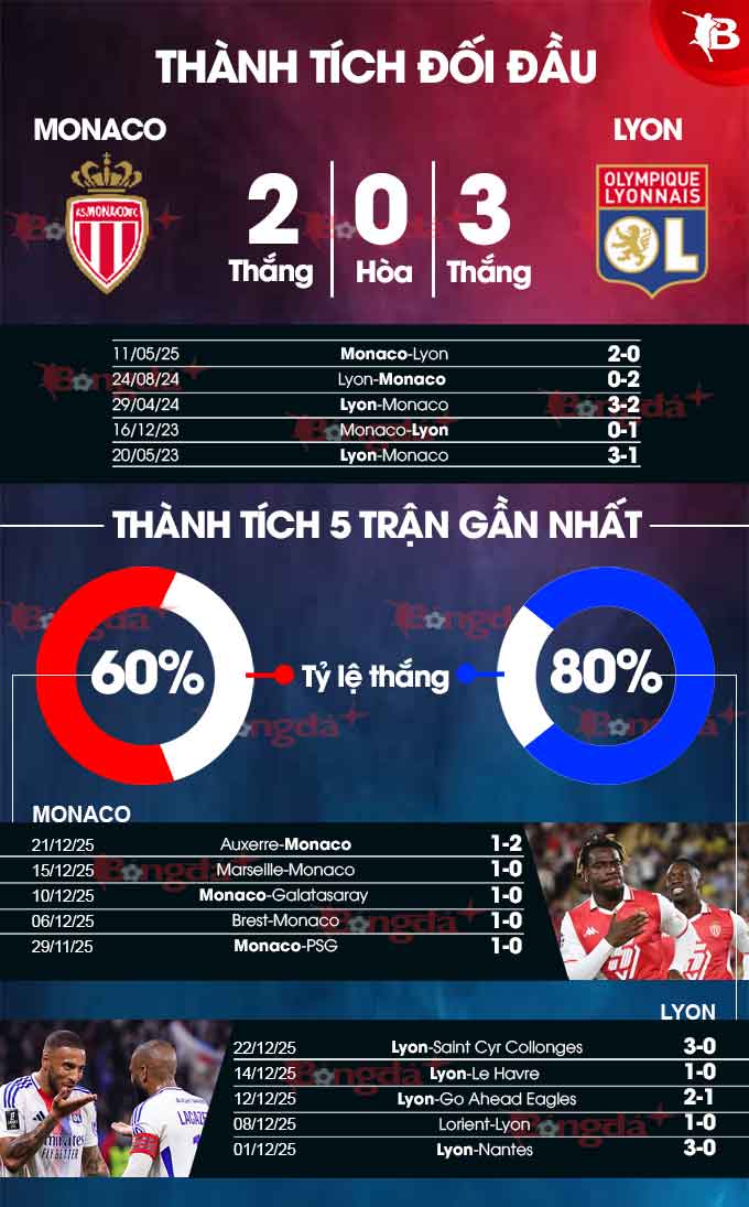 Mùa này, Lyon chỉ thắng 2/8 trận trên sân khách tại Ligue 1, còn lại thua 3 và hòa 3, trong đó có tới 5/7 chuyến xa nhà vừa qua tại giải VĐQG Pháp họ phải lĩnh thẻ đỏ. Xem ra, một Monaco đang thắng 2 trận liên tiếp trên sân nhà sẽ lại giành trọn 3 điểm trước Monaco đêm ngày 3/1 tới.