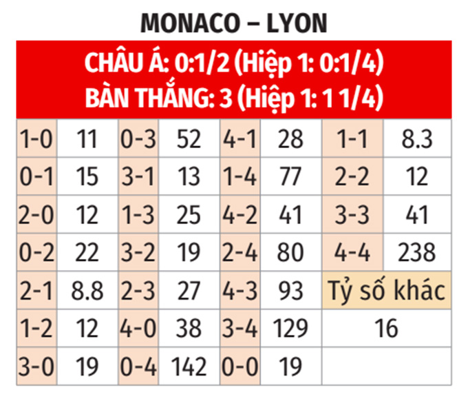 - Hiệp 1 không quá 1 bàn: 7/10 cuộc đối đầu gần nhất, 4/5 trận vừa qua của Monaco và 4/5 trận gần đây của Lyon đều chứng kiến không quá 1 lần lưới rung hiệp 1. Ngoài ra, 4/5 cuộc chạm trán gần đây tại Louis II, 5/6 trận sân nhà vừa qua của Monaco và 9/11 chuyến làm khách gần nhất của Lyon cũng có tối đa 1 bàn tắng trong hiệp 1.