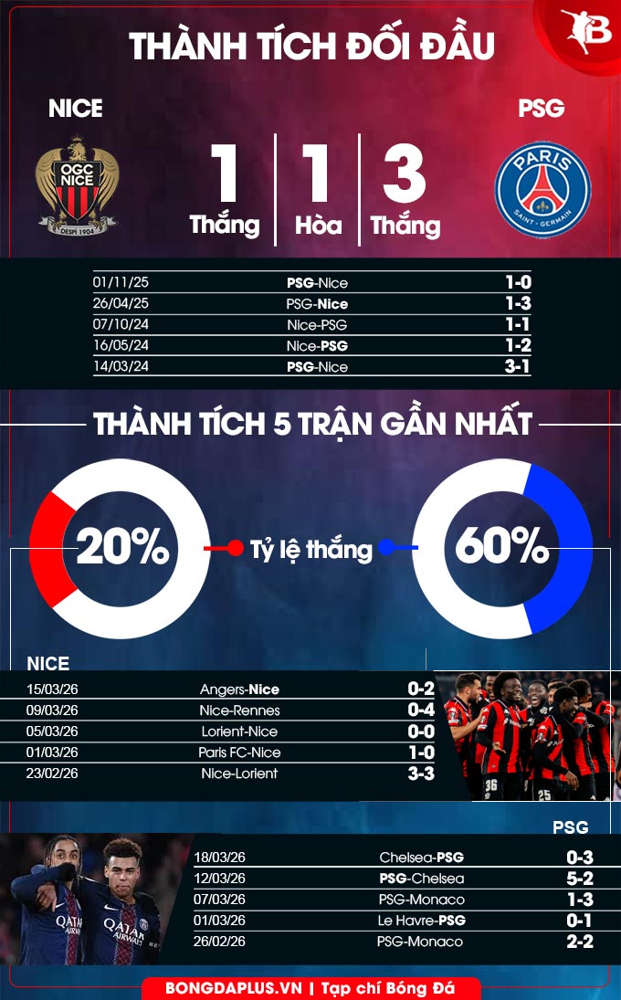 Cần nhấn mạnh rằng, hai chiến thắng trước đó của Nice trên sân nhà đều trước các đội hiện đang nằm trong top 5, đánh bại Lille và Lyon năm ngoái với tổng tỷ số 5-2. Bên cạnh đó, Đại bàng nhỏ đã giành được điểm ở 2/3 lần đối đầu gần nhất với PSG tại Ligue 1, trong đó có trận hòa 1-1 ở lần gặp nhau gần nhất trên sân Allianz Riviera.