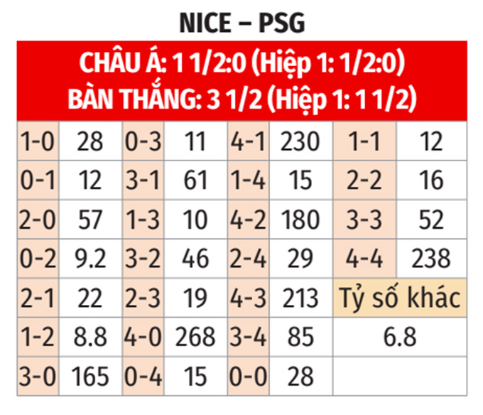 - Hai đội đều ghi bàn: 5/6 cuộc đối đầu gần nhất, 6/8 trận sân nhà vừa qua của Nice và 5/8 trận gần đây của PSG đều có ít nhất 1 bàn thắng cho mỗi đội. Hơn nữa, 5/8 chuyến làm khách vừa qua tại Ligue 1 của PSG cũng khép lại mà không đội nào giữ sạch lưới nhà.