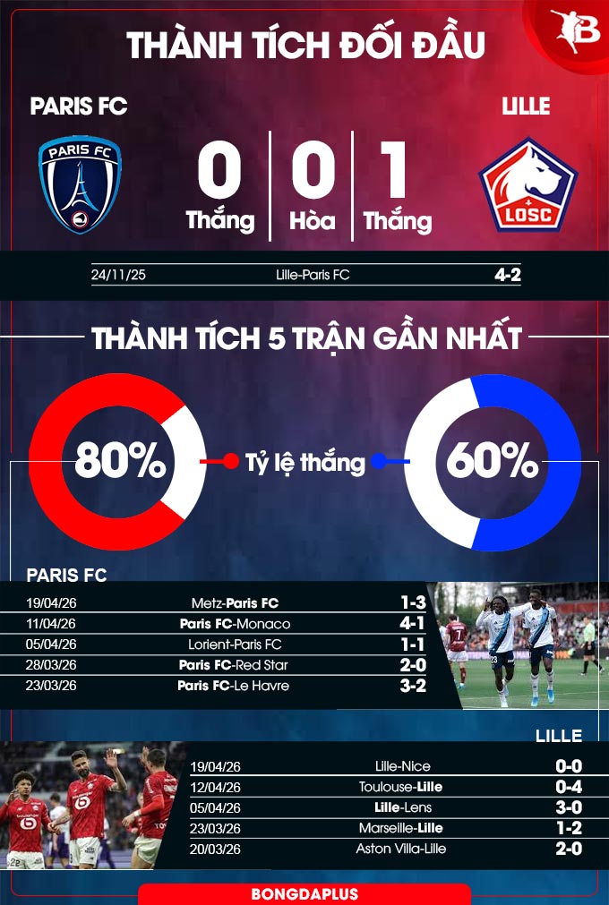 - Lẻ bàn thắng: 4 trận sân nhà gần đây tại Ligue 1 của Paris FC đều kết thúc lẻ bàn thắng. 7/9 trận sân khách vừa qua của Lille xảy ra tình trạng tương tự.