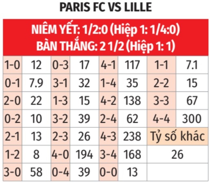 - Tối thiểu 1 bàn hiệp 1: 7/8 trận sân nhà gần đây của Paris FC đều có từ 1 bàn thắng trở lên trong hiệp 1. Tình trạng tương tự xảy ra ở 5/6 trận sân khách vừa qua của Lille.