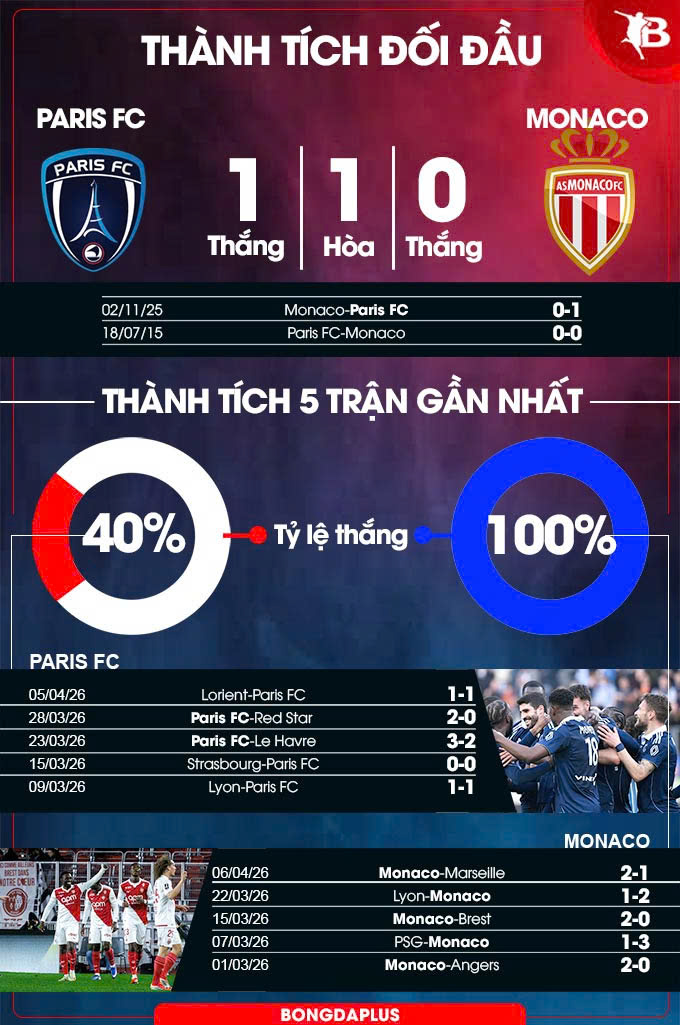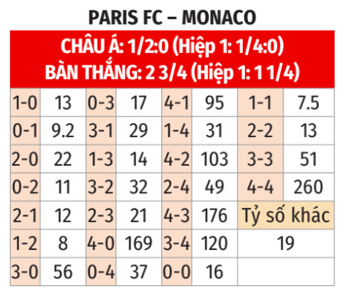 - Monaco ghi bàn hiệp 1: Monaco ghi ít nhất 1 bàn trong hiệp 1 ở 6/9 trận gần nhất. Ngoài ra, họ cũng làm được điều tương tự ở 2/3 chuyến làm khách vừa qua. Trong khi Paris FC để thủng lưới ít nhất 1 bàn trong hiệp 1 ở 5/8 trận sân nhà gần đây.