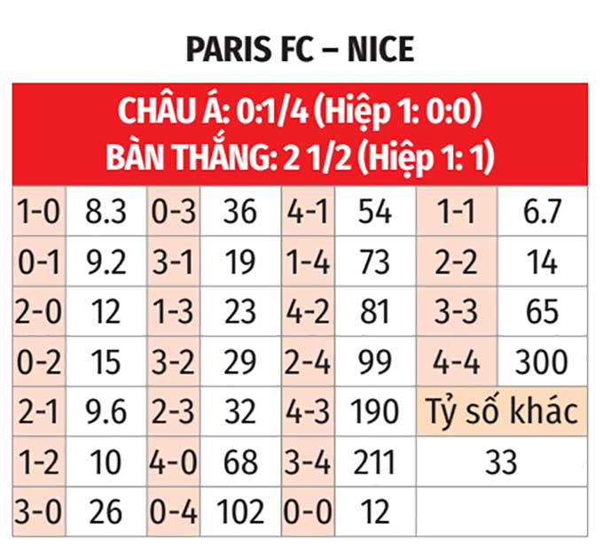 - Tối đa 2 bàn: 4/6 trận sân khách gần đây của Nice đều chỉ có tối đa 2 bàn. 3/4 trận vừa qua của Paris FC số lần lưới rung cũng đều dưới 3.