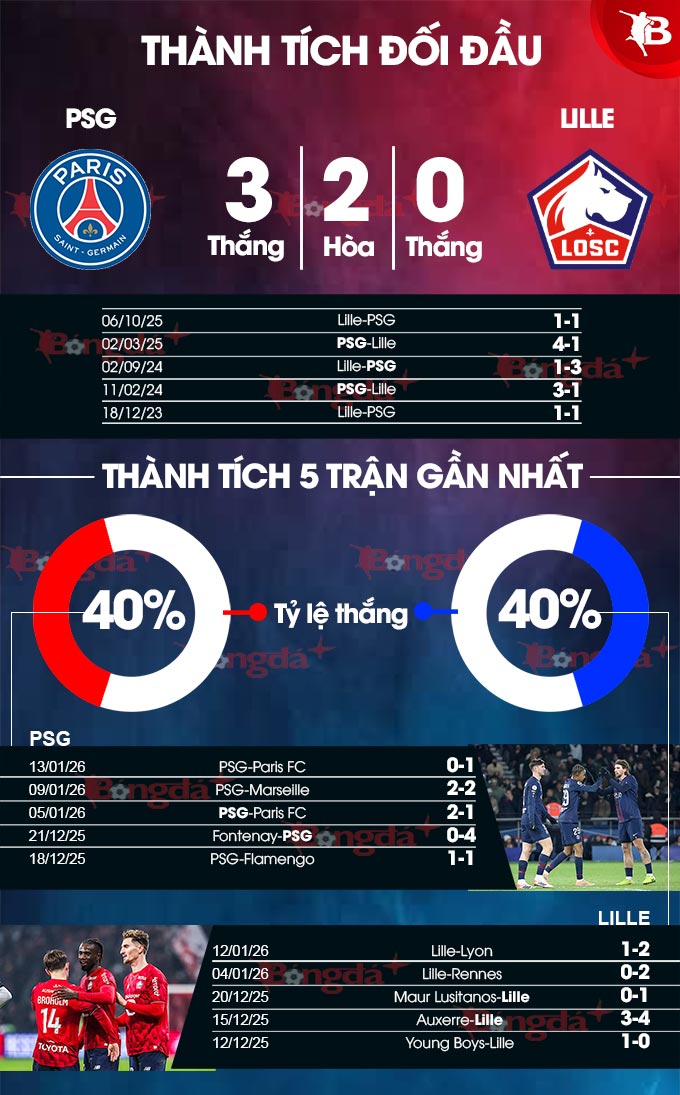 1. Ở 27 lần làm khách gần nhất tại sân Parc des Princes của PSG, Lille chỉ thắng vỏn vẹn 1 trận, còn lại thua 22 và hòa 4 trận. Thắng lợi duy nhất nói trên của Lille là trận thắng 1-0 ngày 3/4/2021 tại Ligue 1.