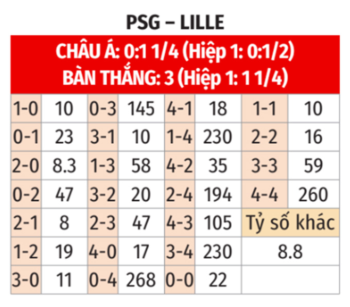 - Lẻ bàn thắng: 5/6 cuộc đối đầu gần nhất tại Công viên các Hoàng tử, 6/7 trận sân nhà vừa qua của PSG và 6/7 trận gần đây của Lille đều có tổng bàn thắng là lẻ. Hơn nữa, 4/5 chuyến làm khách vừa qua của Lille cũng khép lại với tổng bàn thắng không chia hết cho 2.