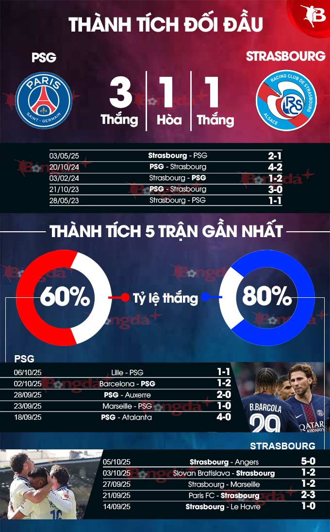 Xét về đối đầu, PSG chỉ thua Strasbourg đúng 1 lần ở 16 trận đụng độ gần nhất giữa hai đội. Đó chính là chiến thắng 2-1 trên sân La Meinau vào cuối mùa giải trước, khi PSG đã chắc chắn giành chức vô địch Ligue 1 2024/25 sớm 6 vòng đấu.